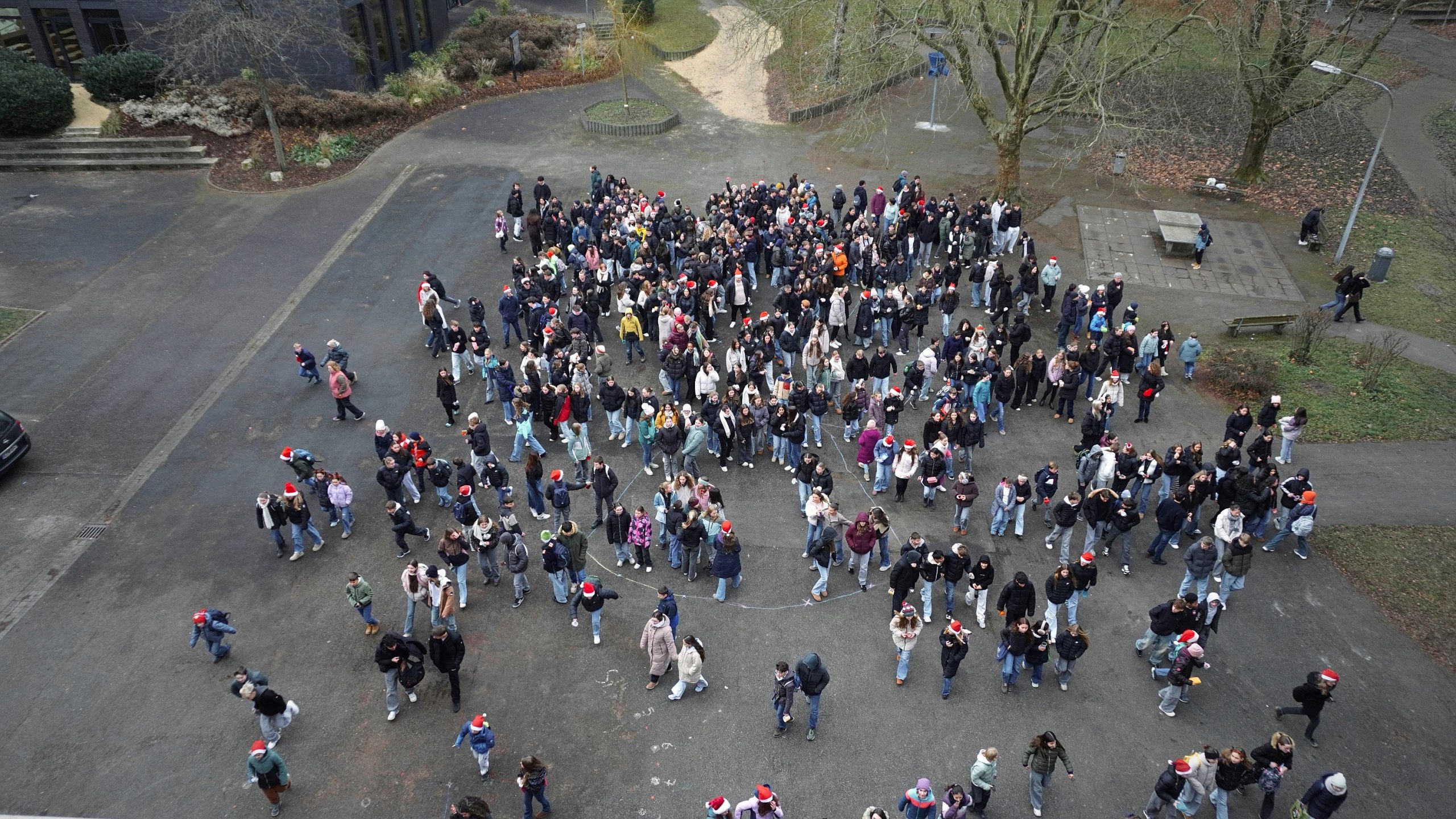 Ein besonderes Zeichen unseres Zusammenhalts war das mittlerweile schon traditionell gewordene Foto aus der Vogelperspektive, bei dem sich Schüler/-innen sowie Lehrkräfte in der Form eines Engels aufstellten.